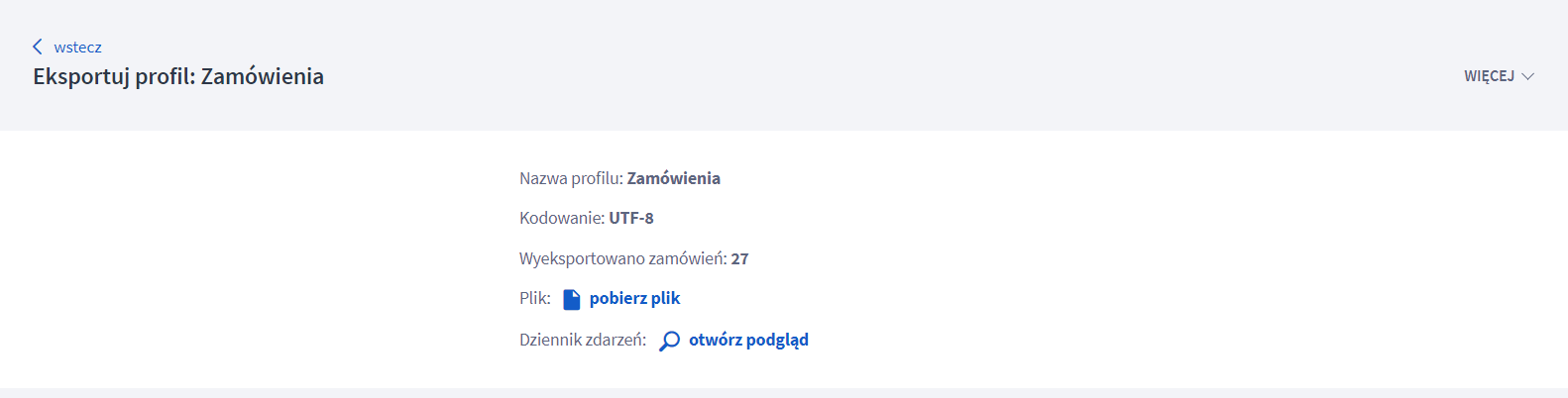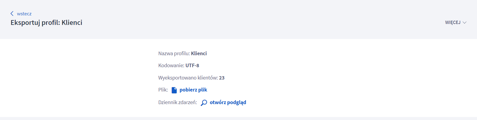 Po kliknięciu przycisku Eksportuj pojawi się informacja o zakończeniu eksportu. Następnie pojawi nam się okno w którym możemy pobrać plik z bazą. Tak samo jak w przypadku raportu zamówień, możemy edytować niektóre pola poprzez wejście w przycisk Więcej > Edytuj ten profil.