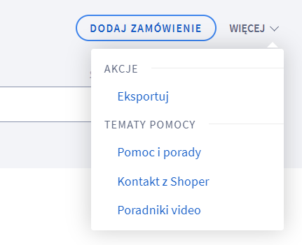 Aby wygenerować bazę zamówień, należy przejść do panelu w Shoperze. W tym celu wybieramy w menu Obsługa Sklepu, a następnie zakładkę Zamówienia. Następnie, przechodzimy do opcji Więcej w prawym górnym rogu, oraz wybieramy Eksportuj.