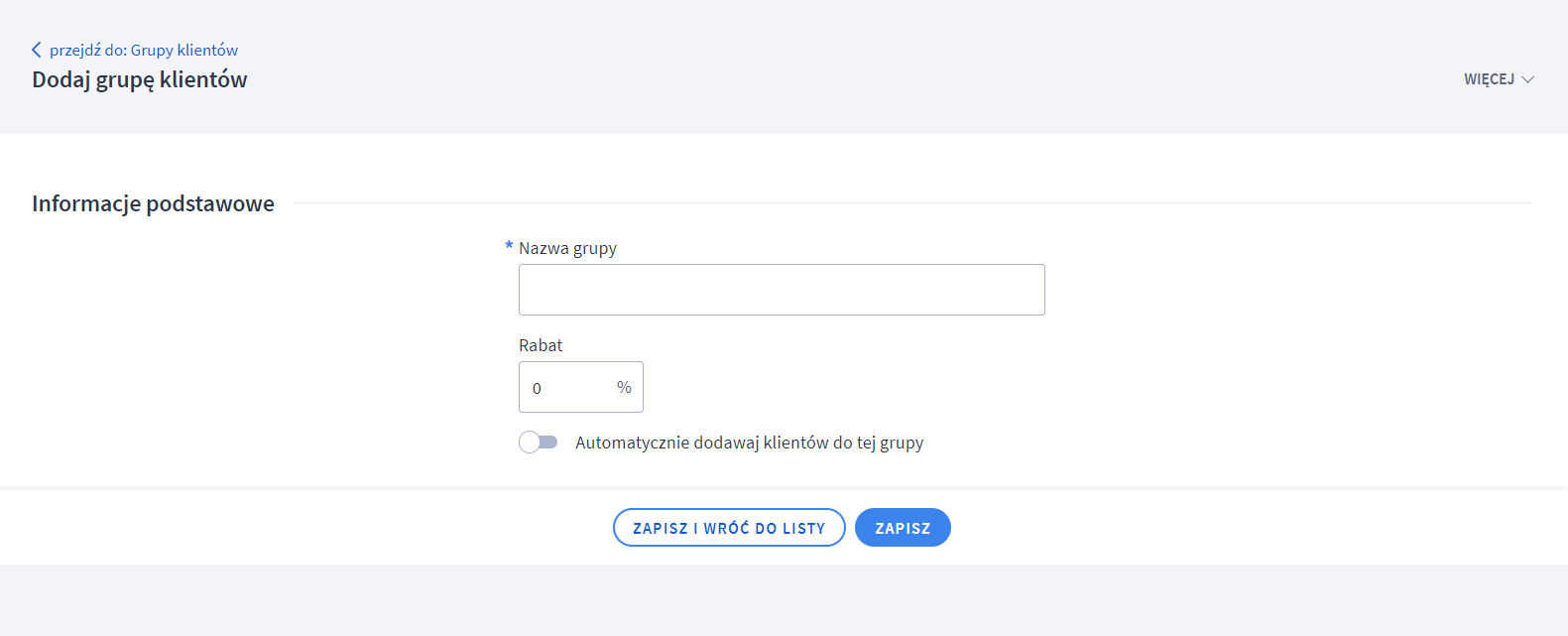 Następnie wybieramy nazwę grupy, ewentualny rabat, oraz możemy wybrać opcję automatycznego dodawania klientów do tej grupy i wybieramy Zapisz.