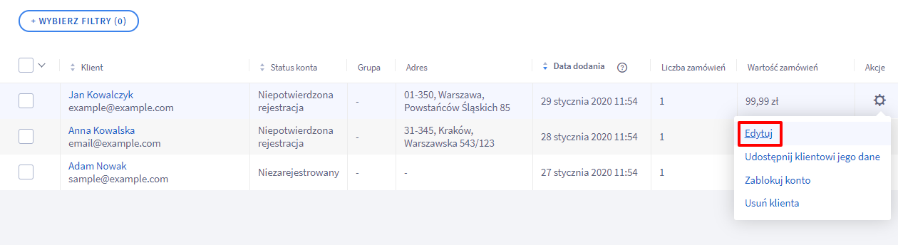 Aby dodać istniejących klientów do grupy, musimy wejść w Obsługa Sklepu > Klienci. Odszukujemy klienta, a następnie klikamy znajdujący się w kolumnie Akcje przycisk Edytuj.