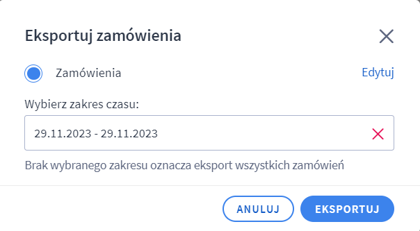 Możemy wybrać wszystkie zamówienia, lub wybrać z danego zakresu. Aby wybrać bazę dla wszystkich zamówień, należy kliknąć X przy zakresie dat. Aby wyeksportować bazę, wybieramy Eksportuj.