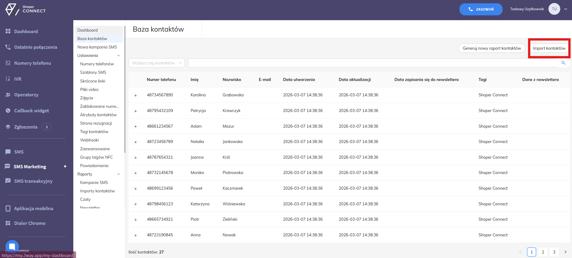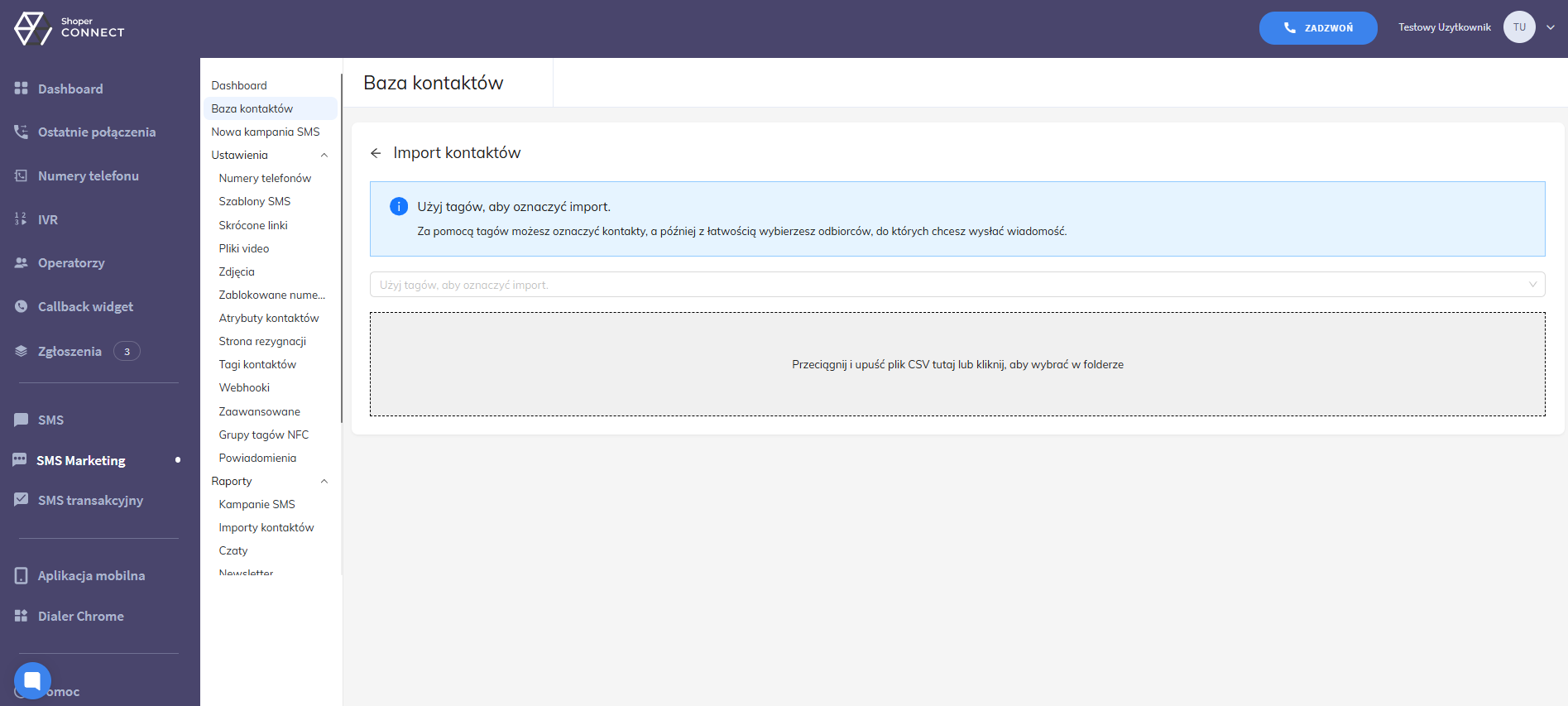 Aby zaimportować nowe kontakty należy kliknąć w przycisk “Import kontaktów”. Na tej stronie możesz dodać tag, który będzie przypisany do zaimportowanych kontaktów, dzięki temu w łatwy sposób możesz wybrać do których klientów zostaną wysłane smsy.