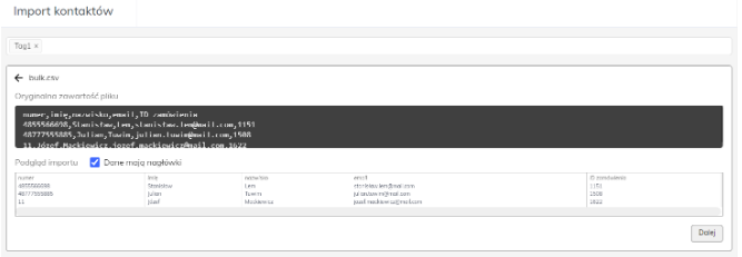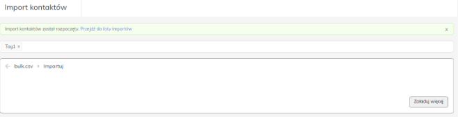 Po przypisaniu danych do odpowiednich atrybutów kliknij dalej aby rozpocząć import. Pojawi się komunikat “Import kontaktów został rozpoczęty” wraz z linkiem do listy importów gdzie możesz sprawdzić status importu.
