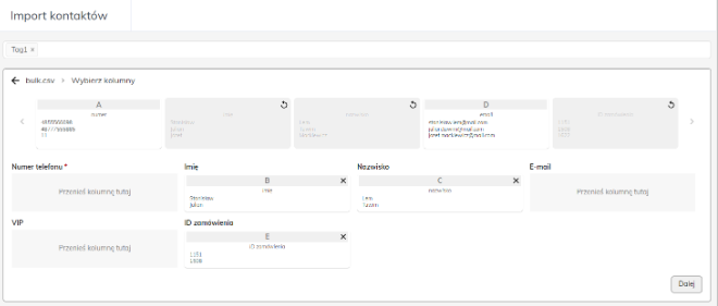 W następnym kroku należy przypisać dane do odpowiedniego pola (atrybutu kontaktu). Atrybuty podstawowe to Numer telefonu, Imię, Nazwisko i E-mail, aby zaimportować inne atrybuty należy najpierw utworzyć dodatkowe atrybuty w Ustawieniach.