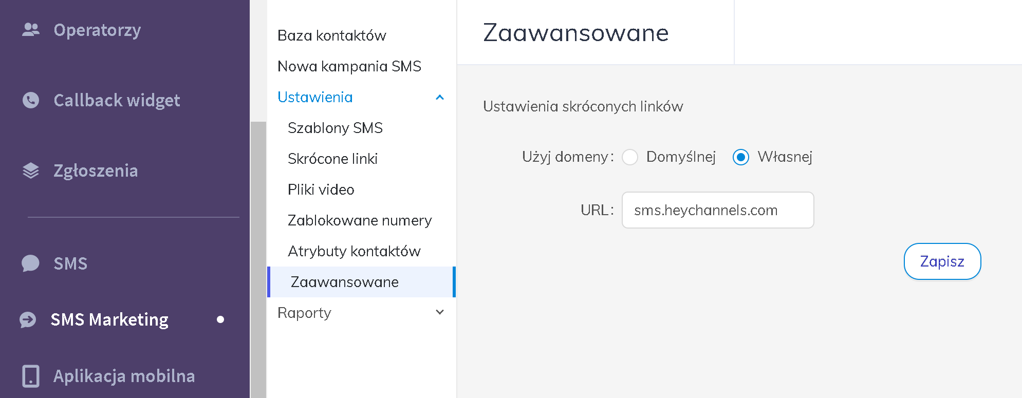 Wybierz "Użyj domeny: Własnej" i w polu URL wpisz Nazwę domeny z przedrostkiem, w tym przypadku sms.heychannels.com. Zapisz ustawienia i zacznij korzystać z własnych skróconych linków.