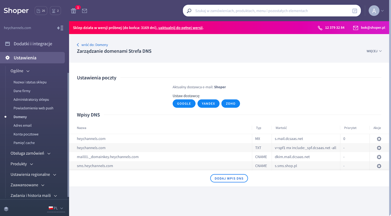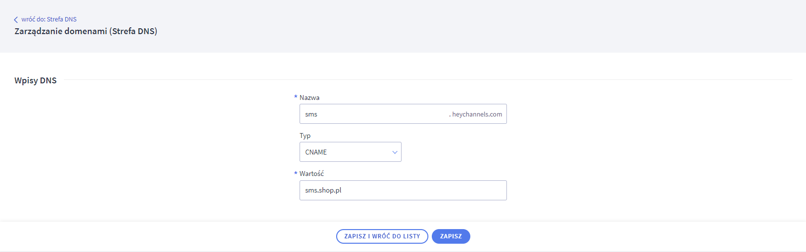 Po skonfigurowaniu wpisu DNS kliknij zapisz i skontaktuj się z nami na czacie, mailowo (support@shoperconnect.pl) lub telefonicznie pod numerem +48732220000. Zapamiętaj Nazwę domeny, czyli w tym przypadku sms.heychannels.com, będzie nam potrzebna do skonfigurowania ustawień po naszej stronie.