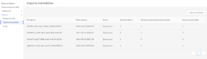 Znajdują się tutaj informacje o importach. Można sprawdzić datę importu, status (W oczekiwaniu lub zakończony) i ilość kontaktów zaimportowanych lub odrzuconych.