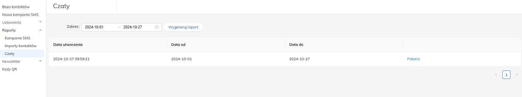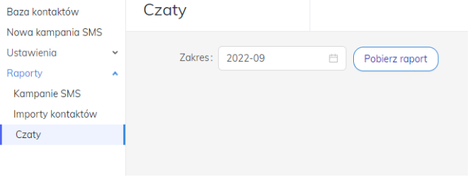 Raport z czatów sms. Są to wszystkie czaty sms, nie tylko te stworzone na skutek kampanii SMS. Raport można pobrać za wybrany miesiąc. W raporcie znajduje się treść wiadomości, data, numer klienta, twój numer oraz ilość smsów wykorzystanych na daną wiadomość.