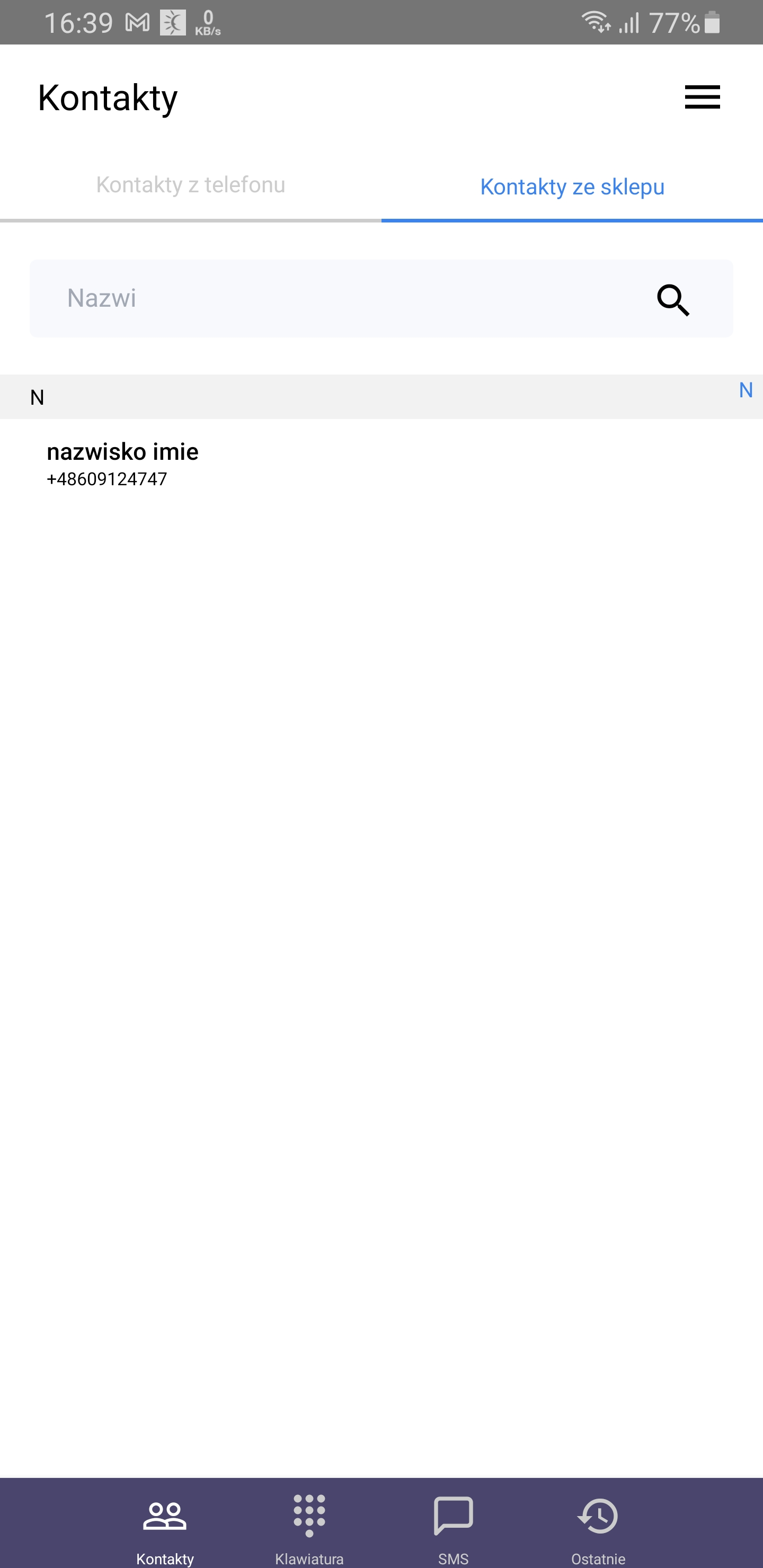 W tej sekcji znajdziesz wszystkie kontakty ułożone w kolejności alfabetycznej. Podzielone są na kontakty zapisane w pamięci telefonu oraz dane kontaktowe klientów z Shoper. Jest tutaj również możliwość wyszukiwania po imieniu, nazwisku czy numerze telefonu.