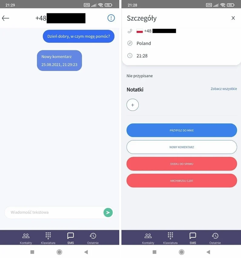 “Archiwizuj czat” - Czat zostanie zarchiwizowany i nie będzie możliwości kontynuowania rozmowy. Aby wysłać nową wiadomość na zarchiwizowany numer, konieczne jest utworzenie nowego czatu.