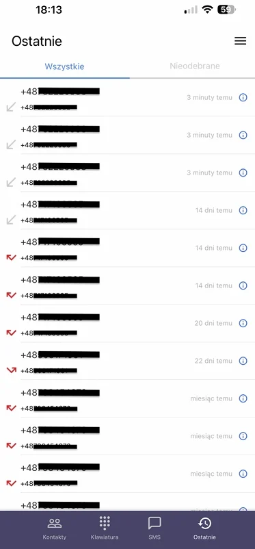 Znajdziesz tutaj rejestr połączeń, który jest podzielony na dwie historie zdarzeń. Możesz wybrać widok wszystkich połączeń oraz tylko tych nieodebranych.
