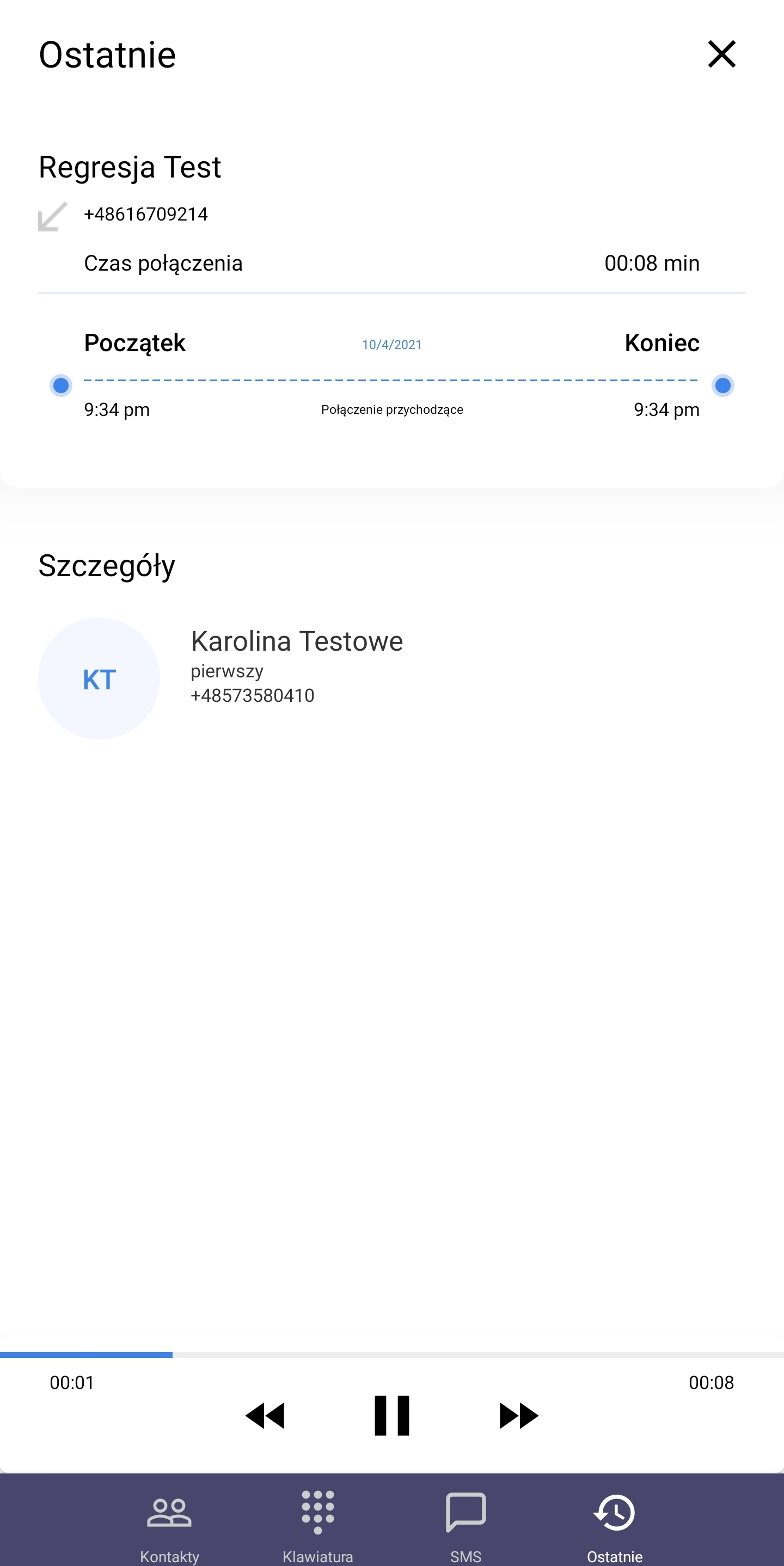 Po naciśnięciu na konkretne zdarzenie, znajdziesz się w jego szczegółowym widoku gdzie sprawdzisz: czas trwania, godzinę, rodzaj połączenia (przychodzące/ wychodzące) oraz przypisanego operatora. Możesz również odsłuchać nagrane rozmowy (ustawienia nagrywania połączeń znajdują się w panelu administratora sklepu w aplikacji Shoper Connect).