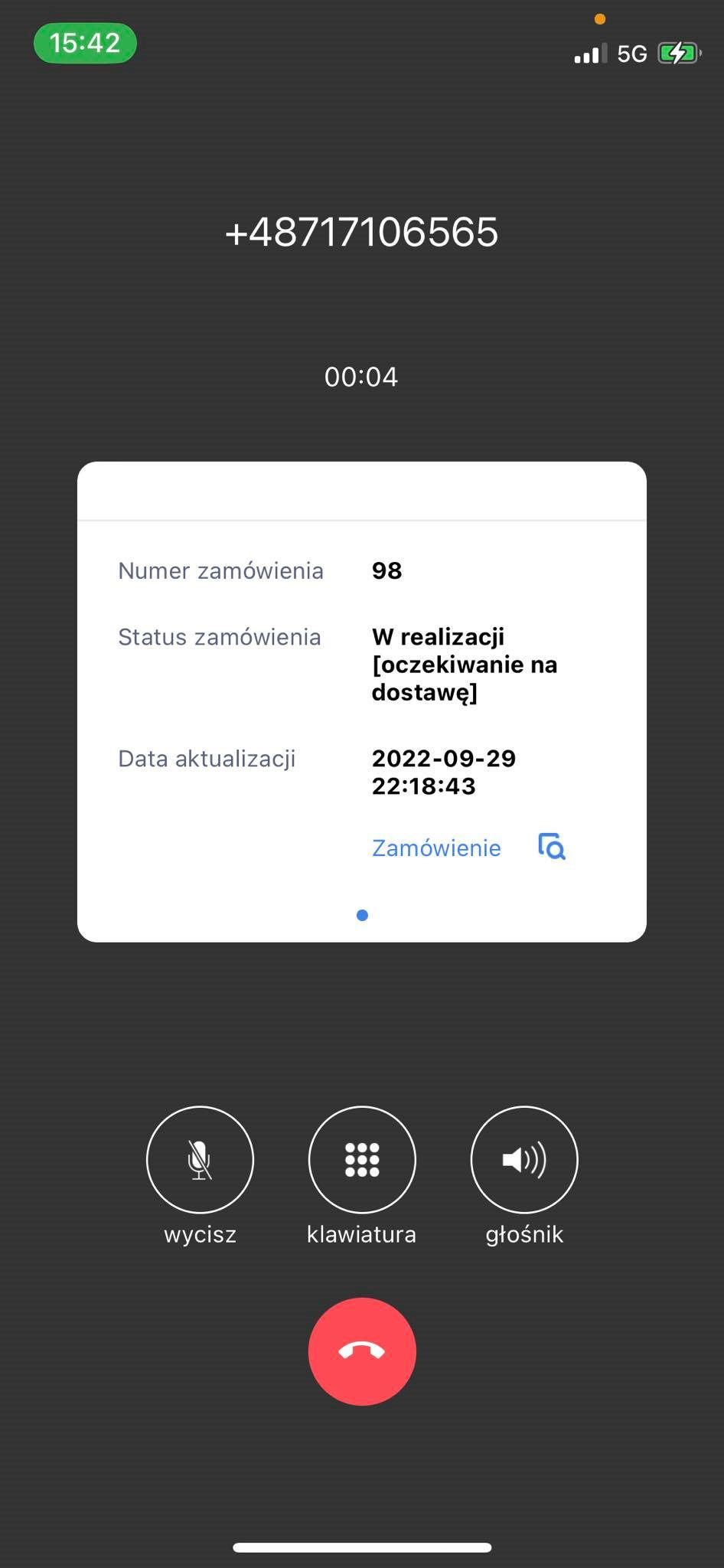 W przypadku kiedy otrzymujesz połączenie przychodzące od jednego z wcześniej zapisanych kontaktów lub od klienta, który złożył zamówienie w sklepie bez rejestracji, jego detale zostaną wyświetlone przy ekranie odbioru. Dodatkowo wyświetlona zostanie informacja o tym, że połączenie przychodzi z sieci Shoper Connect. Na ekranie połączenia przychodzącego będzie również informacja o ostatnim zamówieniu klienta, jego statusie i daty ostatniej aktualizacji statusu.