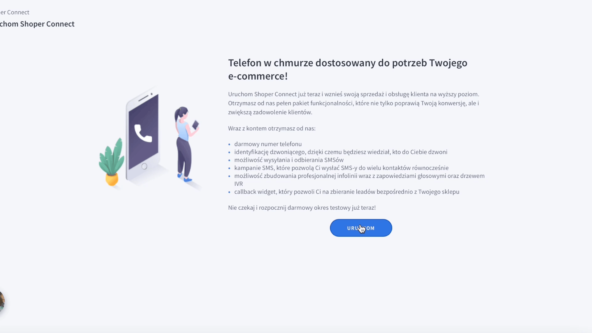 Uruchamianie usługi Shoper Connect/ Shoper Connect SMS rozpoczniesz wciskając przycisk “Konfiguracja”. Zostaniesz przeniesiony do ekranu “Telefon w chmurze dostosowany do potrzeb Twojego e-commerce!". Aby przejść dalej, wciśnij “Uruchom”.