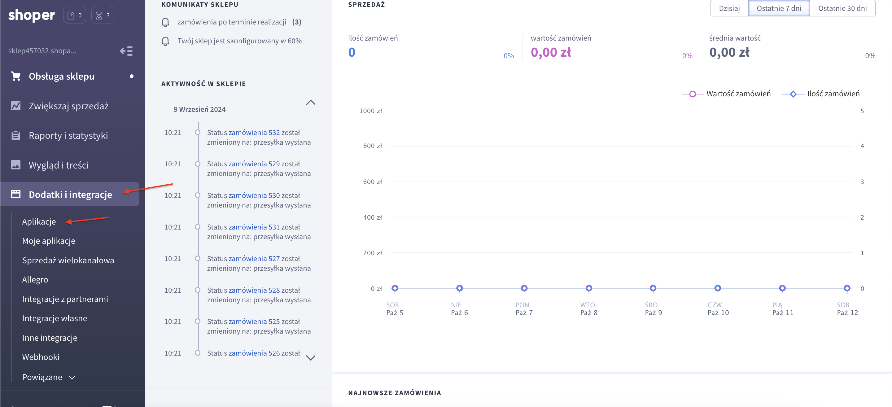 Aby zainstalować aplikację Shoper Connect lub Shoper Connect SMS, zaloguj się na swoje konto na stronie https://www.shoper.pl/myadmin/ i w menu po lewej stronie wejdź w zakładkę “Dodatki i integracje”.