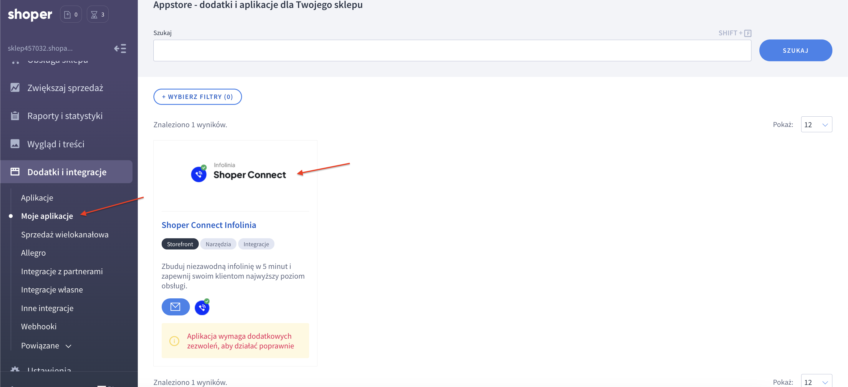 Następnie w sekcji “Aplikacje", za pomocą paska na górze strony, możesz wyszukać “Shoper Connect” lub "Shoper Connect SMS", wybrać i zainstalować wciskając przycisk “Zainstaluj aplikację”.