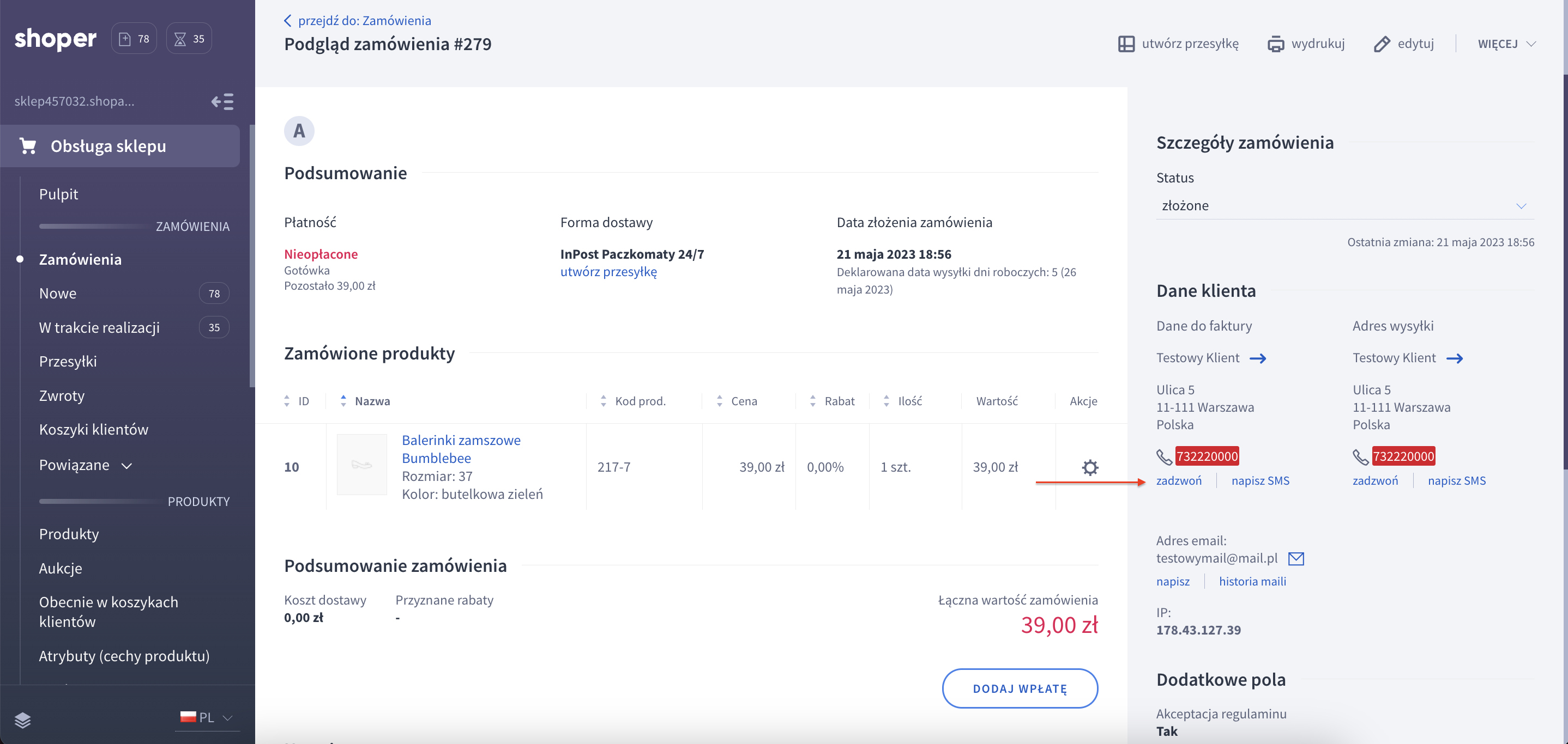 Aby móc wysłać SMSa lub zadzwonić bezpośrednio z panelu Shopera wystarczy wyszukać zamówienie, które Cię interesuje.