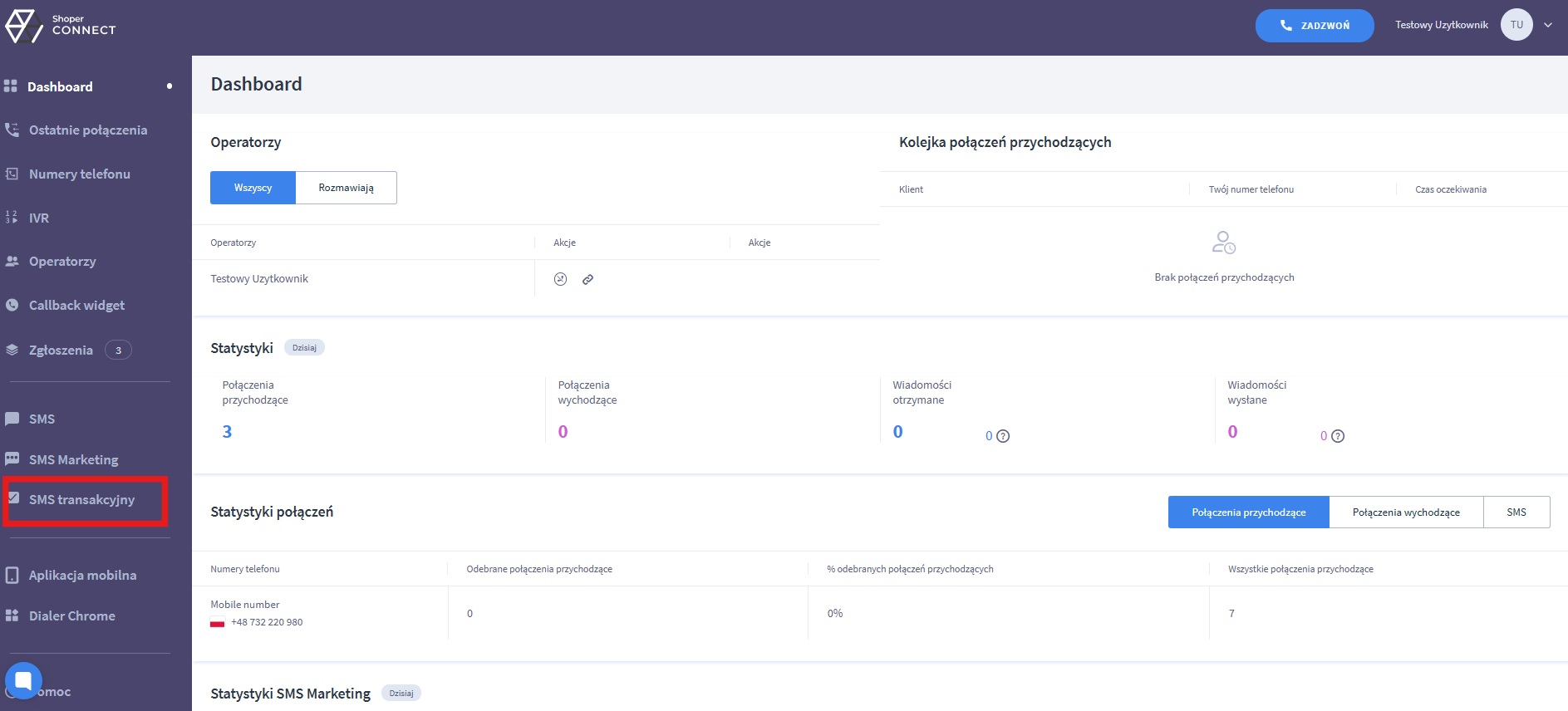 Po zalogowaniu się do panelu Shoper Connect znajdziesz w menu po lewej stronie, zakładkę SMS transakcyjny. Ta opcja pozwoli Ci na skonfigurowanie specjalnych wiadomości SMS, które będą automatycznie wysyłać się do Twoich klientów.