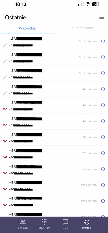 Znajdziesz tutaj rejestr połączeń, podzielonych na wszystkie połączenia wychodzące i przychodzące lub wyszczególnione nieodebrane.