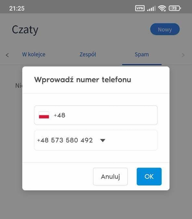 “Dodaj do spamu” - Czat zostanie przeniesiony do zakładki “Spam”. Jeżeli czat został przeniesiony do spamu przez pomyłkę możesz przywrócić czat opcją “Odzyskaj ze spamu”