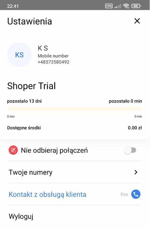 Klikając na trzy paski w prawym górnym rogu zostaniesz przeniesiony do ustawień aplikacji. Znajdziesz tam następujące dane dotyczące: nazwy naszego konta, wykupionego planu, dostępnych środków i minut. Poniżej wyświetlone są dodatkowe opcje: