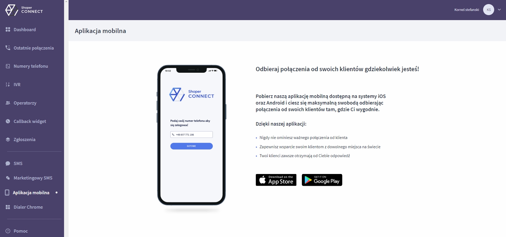 “Kontakt z obsługą klienta”- możliwość wykonania bezpłatnego połączenia do konsultanta Shoper Connect, który doradzi oraz pomoże w rozwiązaniu problemów z aplikacją.