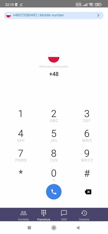 Klawiatura daje możliwość ręcznego wpisania numeru, na jaki chcesz zadzwonić. Możesz również dostosować preferowany prefix międzynarodowy klikając w ikonę flagi (prefix możemy wyszukać wpisując kraj lub cyfry), a na samej górze ekranu widnieje numer, którym aktualnie się identyfikujesz (można go zmienić po naciśnięciu w błękitną belkę). W aplikacji Shoper Connect możesz wykonywać połączenia nie tylko do PL lecz także połączenia międzynarodowe.
