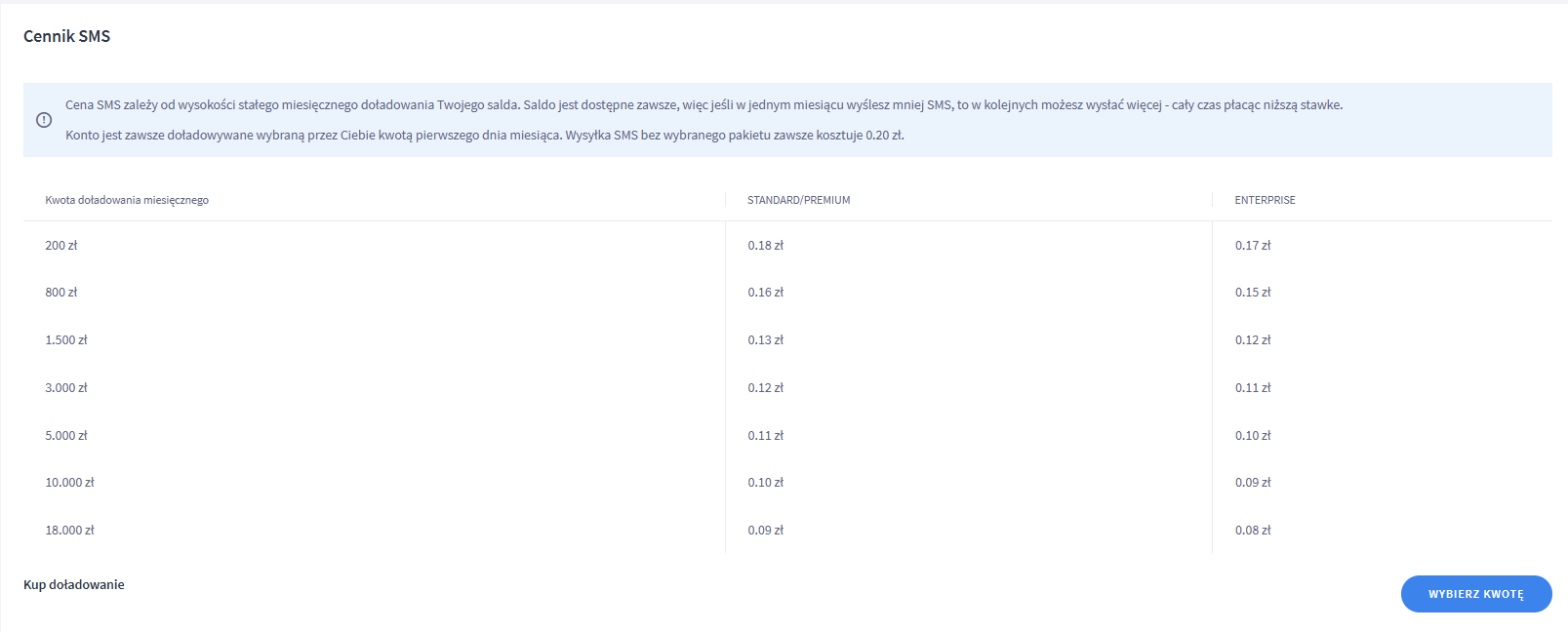 Plan Enterprise (399 zł miesięcznie) – dla większych sklepów potrzebujących więcej opcji personalizacji. Obejmuje funkcje z poprzednich planów oraz większe wsparcie przy wysyłce kampanii SMS, dostęp do API SMS oraz numery złote i platynowe.