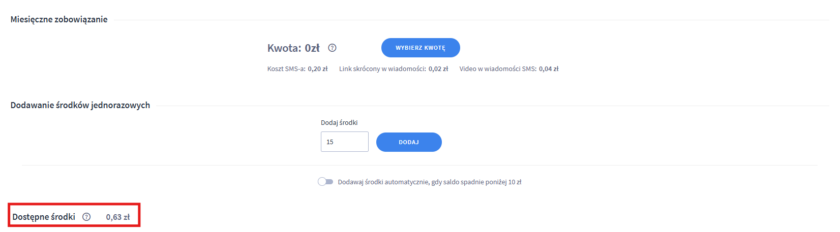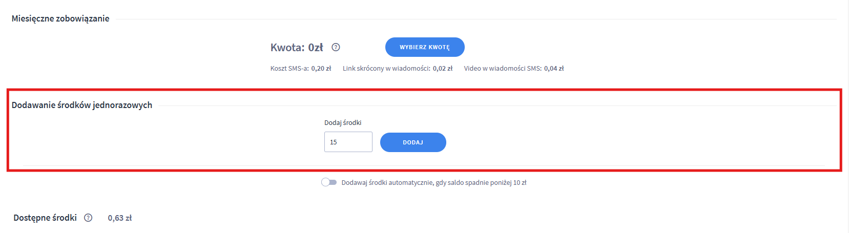 Wpisując wartość w nominale PLN w puste pole i klikając przycisk “Dodaj” możesz dodać wybraną kwotę. Dostępna jest również opcja “Dodawaj środki automatycznie, gdy saldo spadnie poniżej 10 zł”. Aktywujesz ją naciskając na suwak poniżej (w puste pole należy wpisać ilość środków, jaką chcemy dodać gdy nasze saldo spadnie poniżej 10zł).