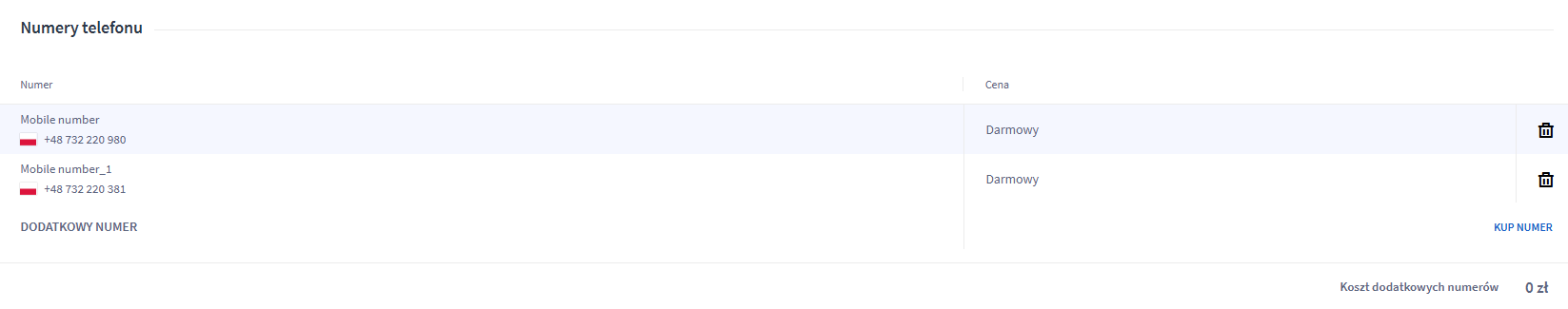 Lista kupionych numerów na twoim koncie i ich koszt. Tutaj możesz zrezygnować z zakupionego numeru klikając ikonę kosza.