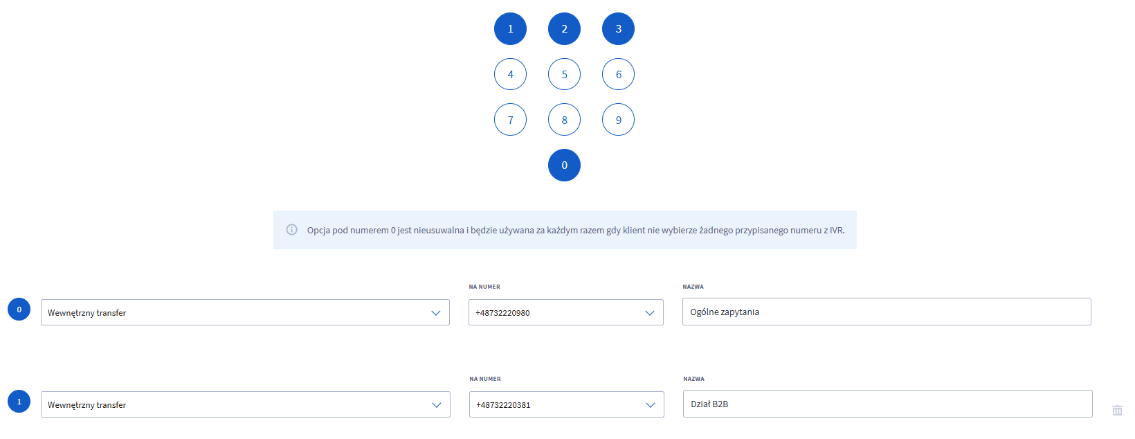 Wybierając klawisze na schemacie klawiatury systemu IVR, możesz włączyć opcje, których potrzebujesz dla swojego systemu. Wybrane klawisze zostaną podświetlone i pojawią się pod klawiaturą wraz ze wszystkimi opcjami akcji.