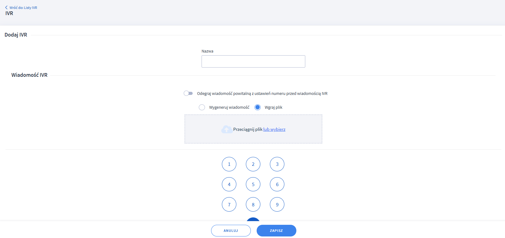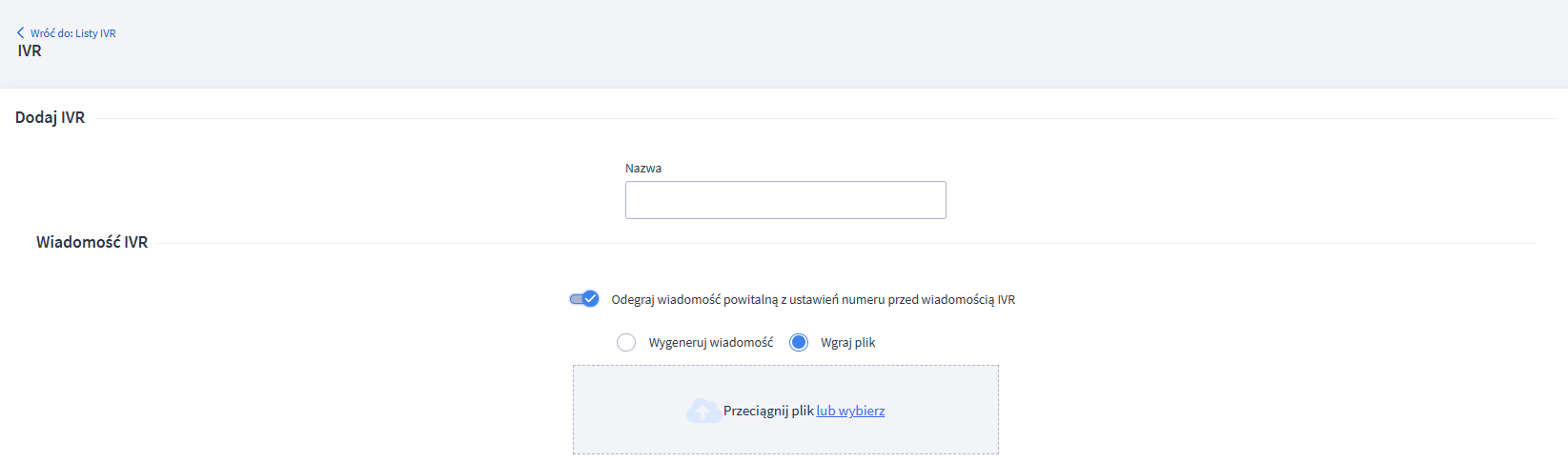 Następnie zostaniesz poproszony o dodanie pliku multimedialnego. Plik możesz przesłać w formacie .mp3 lub .wav z limitem rozmiaru do 50MB. W tym miejscu możesz również zdecydować czy chcesz, żeby klienci słyszeli wiadomość powitalną przed odtworzeniem IVR. Wystarczy zaznaczyć opcję "Odegraj wiadomość powitalną z ustawień numeru przed wiadomością IVR", dokładnie tak, jak na poniższym obrazku.