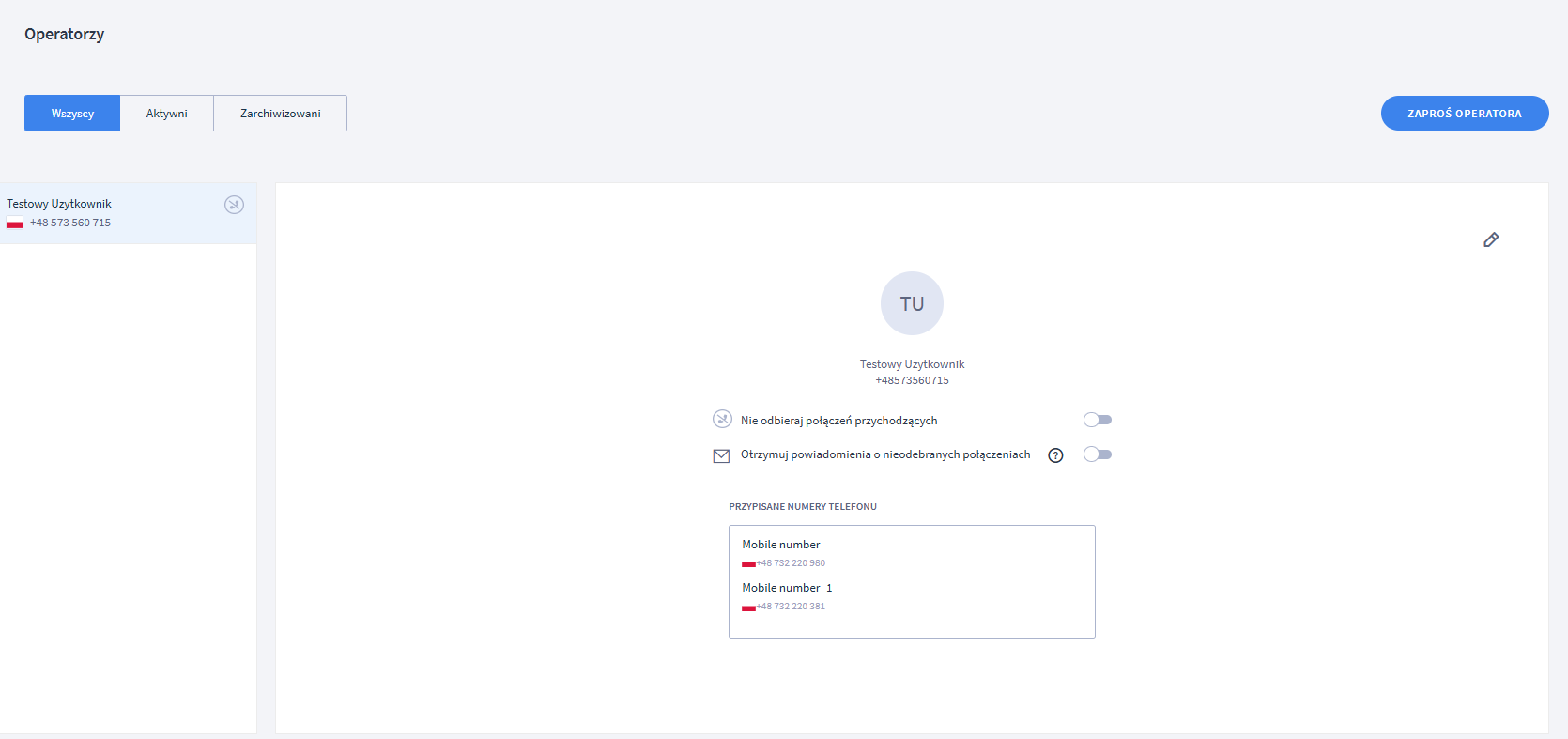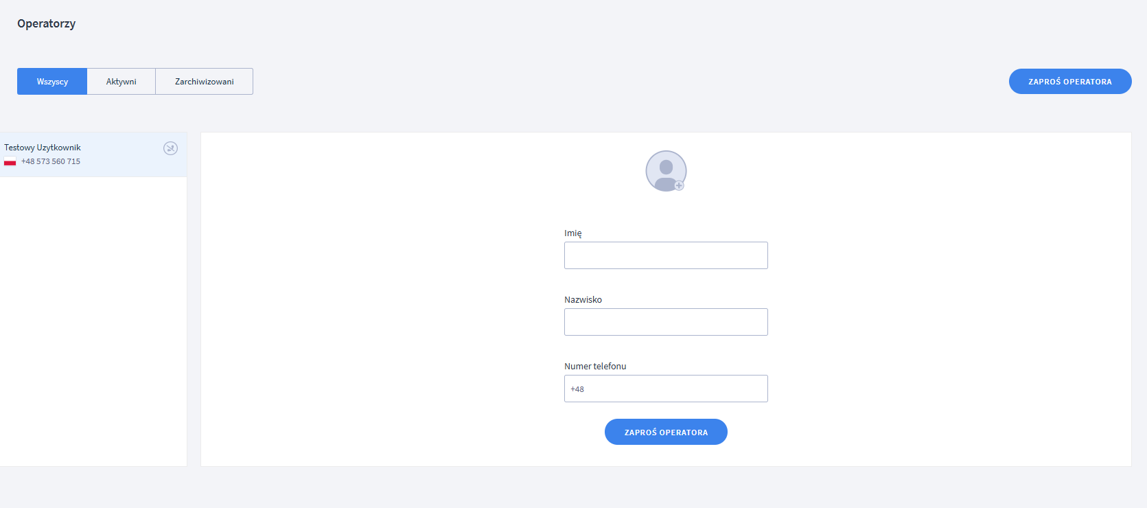 Aby dodać kolejnych operatorów musisz nacisnąć niebieski przycisk “Zaproś Operatora”.