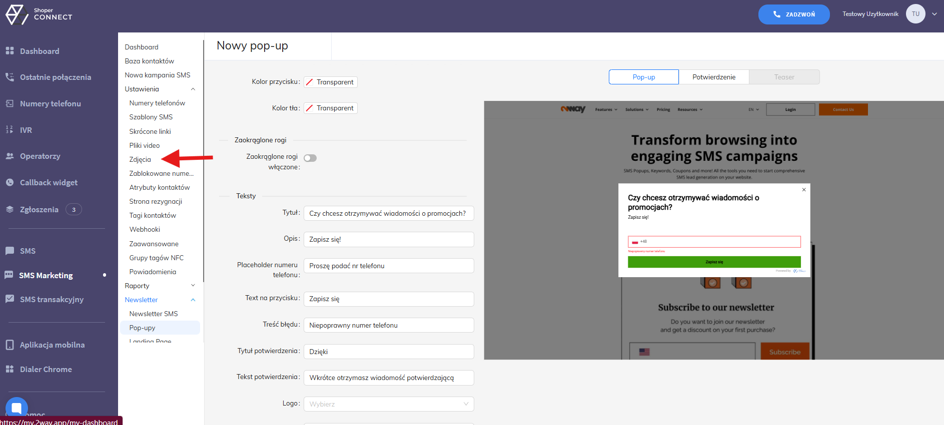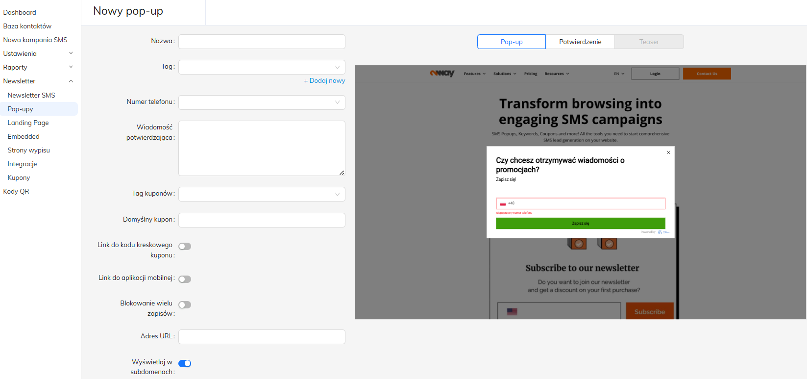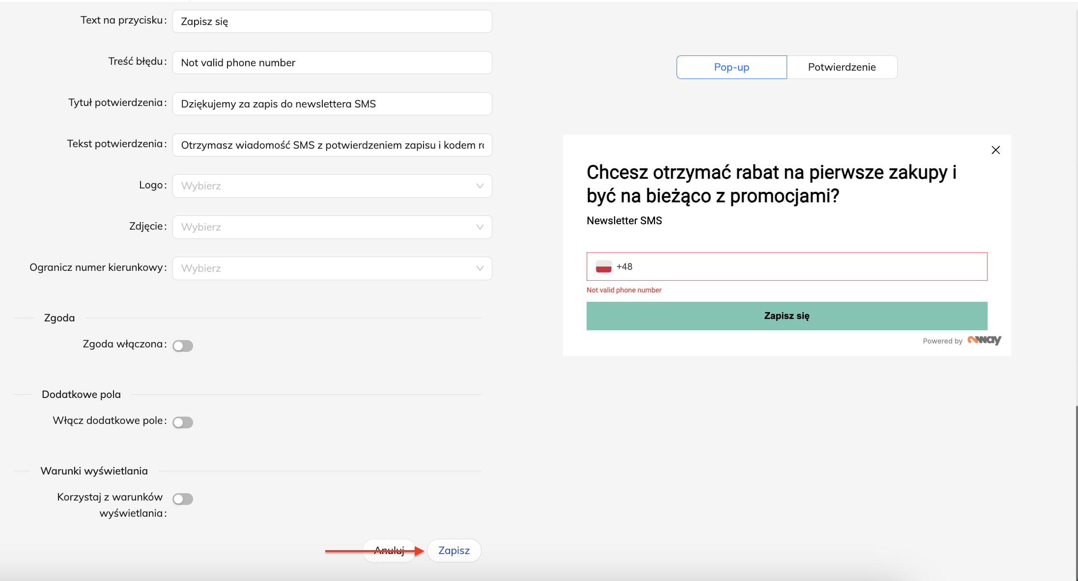 Tag Newslettera: Jeśli chcesz, aby klienci automatycznie byli oznaczani tagiem po zapisaniu się do Newslettera, określ słowo kluczowe dla tego tagu. Jeżeli klient poda już wcześniej numer telefonu, do jego istniejącego kontaktu zostanie dodany nowy tag.