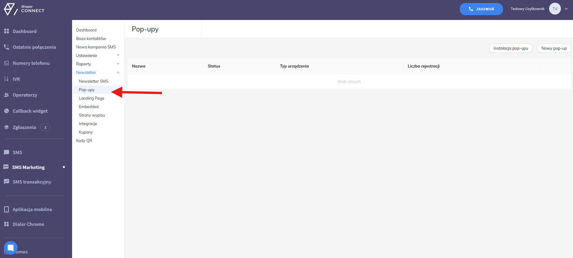 Aby dodać Popup Newsletter SMS do swojego sklepu w Shoperze wejdź do panelu menadżera i kliknij w opcję "SMS Marketing", a następnie w zakładkę "Pop-upy".