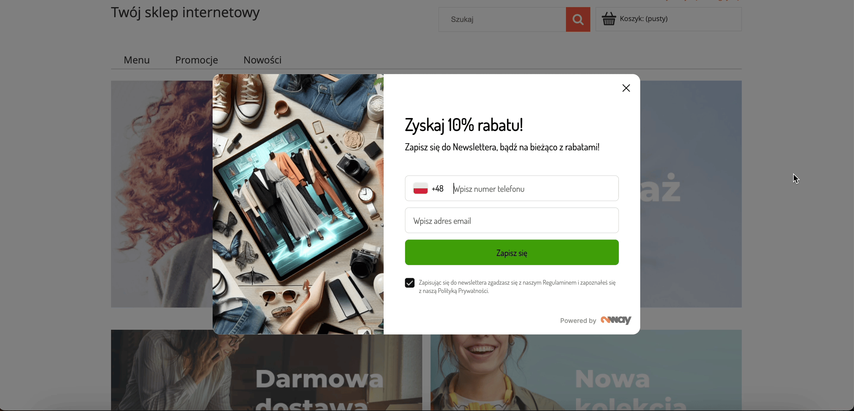 Newsletter jako popup na stronie internetowej to okno, które pojawia się automatycznie po wejściu użytkownika na stronę lub po upływie określonego czasu spędzonego na stronie. Jest to forma zbierania numerów telefonu od odwiedzających witrynę w celu subskrypcji regularnych aktualizacji, informacji, promocji lub treści związanych z daną marką, produktem lub tematem.