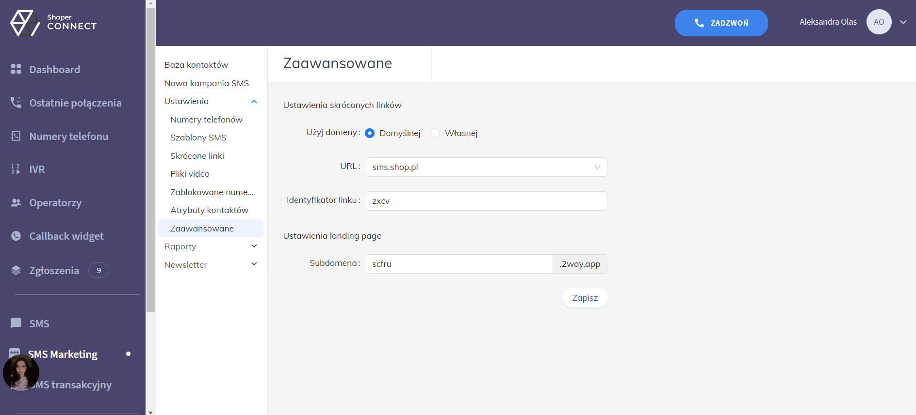Każdy klient, bez względu na plan, może ustawić link skrócony na swoim koncie. W zakładce "SMS marketingowy" przechodzimy do ustawień -> Zaawansowane -> Użyj domeny - Domyślnej - sms.shop.pl (domena własna jest dostępna w planie Enterprise) . Po dokonaniu tych czynności, należy wejść w linki skrócone i tam tworzymy taki link. Linki skrócone są unikalne dla każdej kampanii, nie są wcale krótsze od oryginalnego adresu URL, ale pozwalają na skuteczne obliczenie konwersji (CTR) z przeprowadzanych kampanii. Pamiętajmy też, żeby link poprawnie działał musi być on poprawnie zdefiniowany - przeklejenie linku z poprzedniego wzoru nie zaciągnie poprawnej wartości.