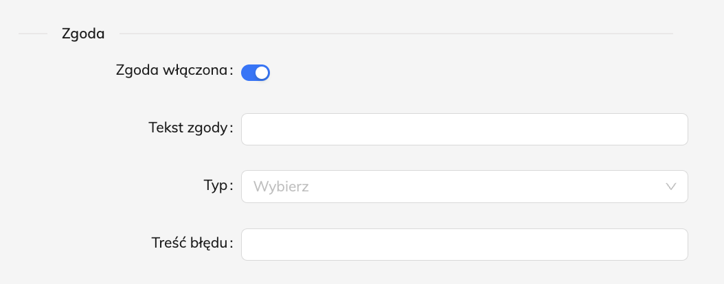 - checkbox: Umożliwi dodanie pola wyboru (checkbox) obok tekstu zgody.